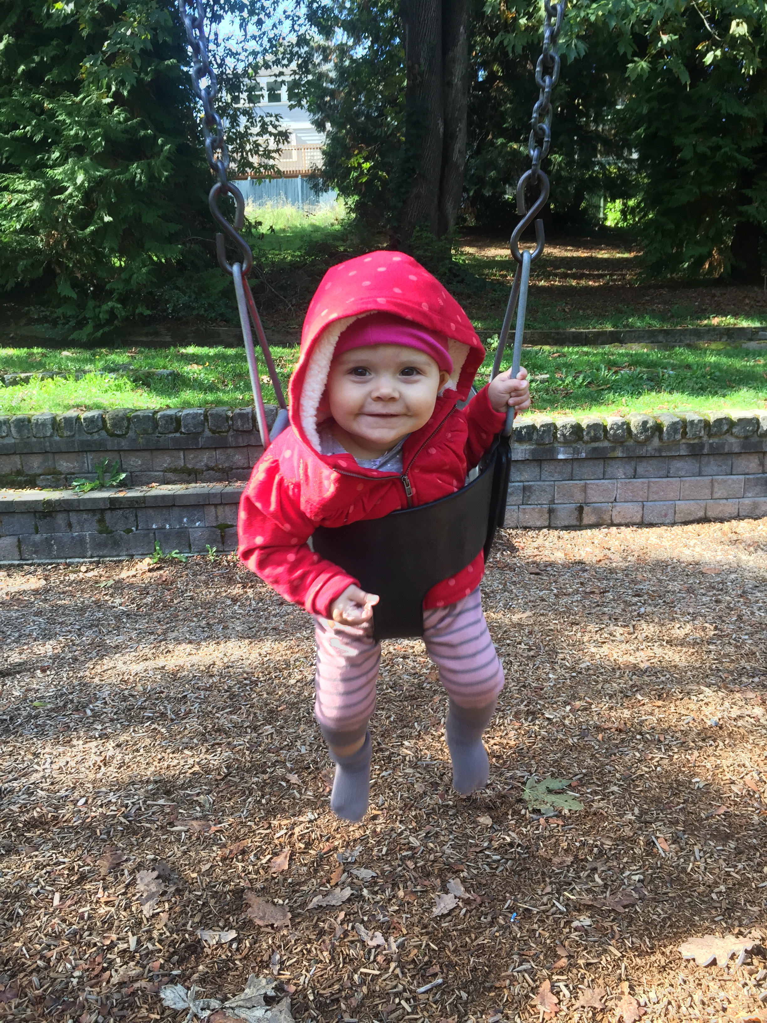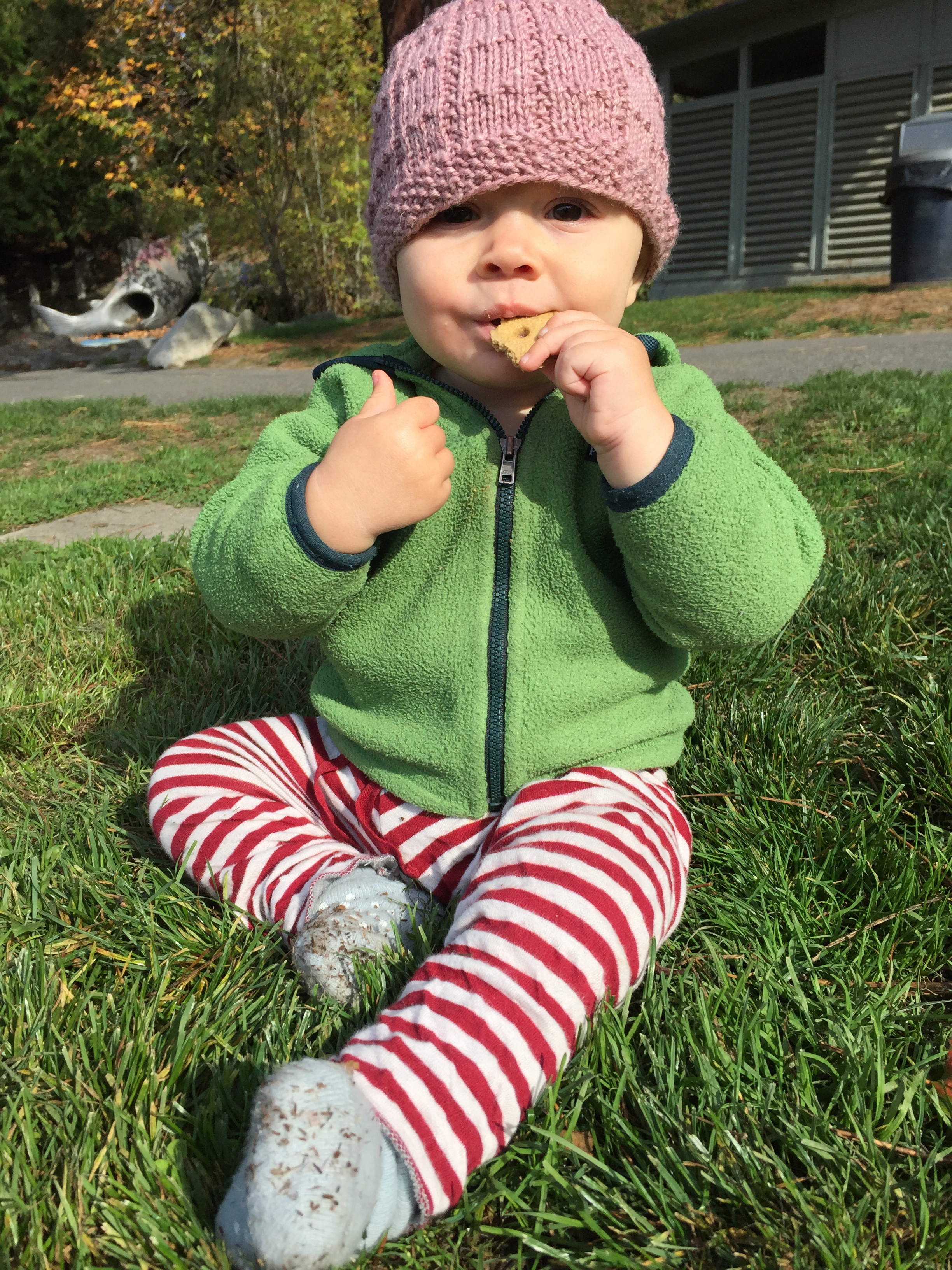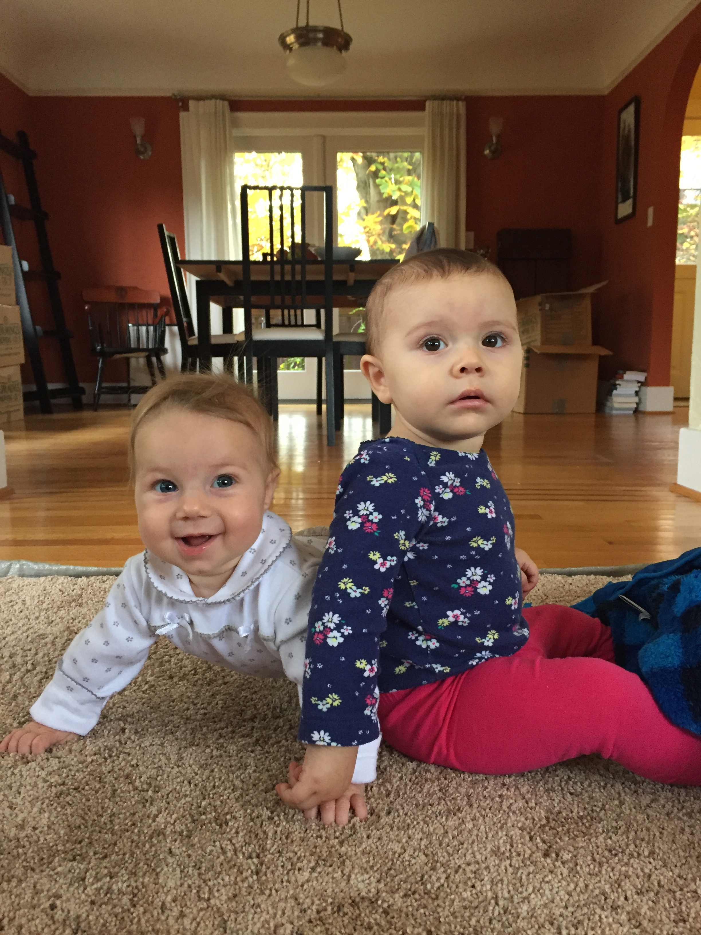 Evvie is a busy little human. She curiously cruises around with her funky crawl and pulls herself eagerly up to stand. She can balance for several seconds and is beginning to control her fall. Speaking of falls, she’s taken several tumbles down the new stairs at Bainbridge and hit her head on a good many tables, but she continues her exploratory mission with gusto.