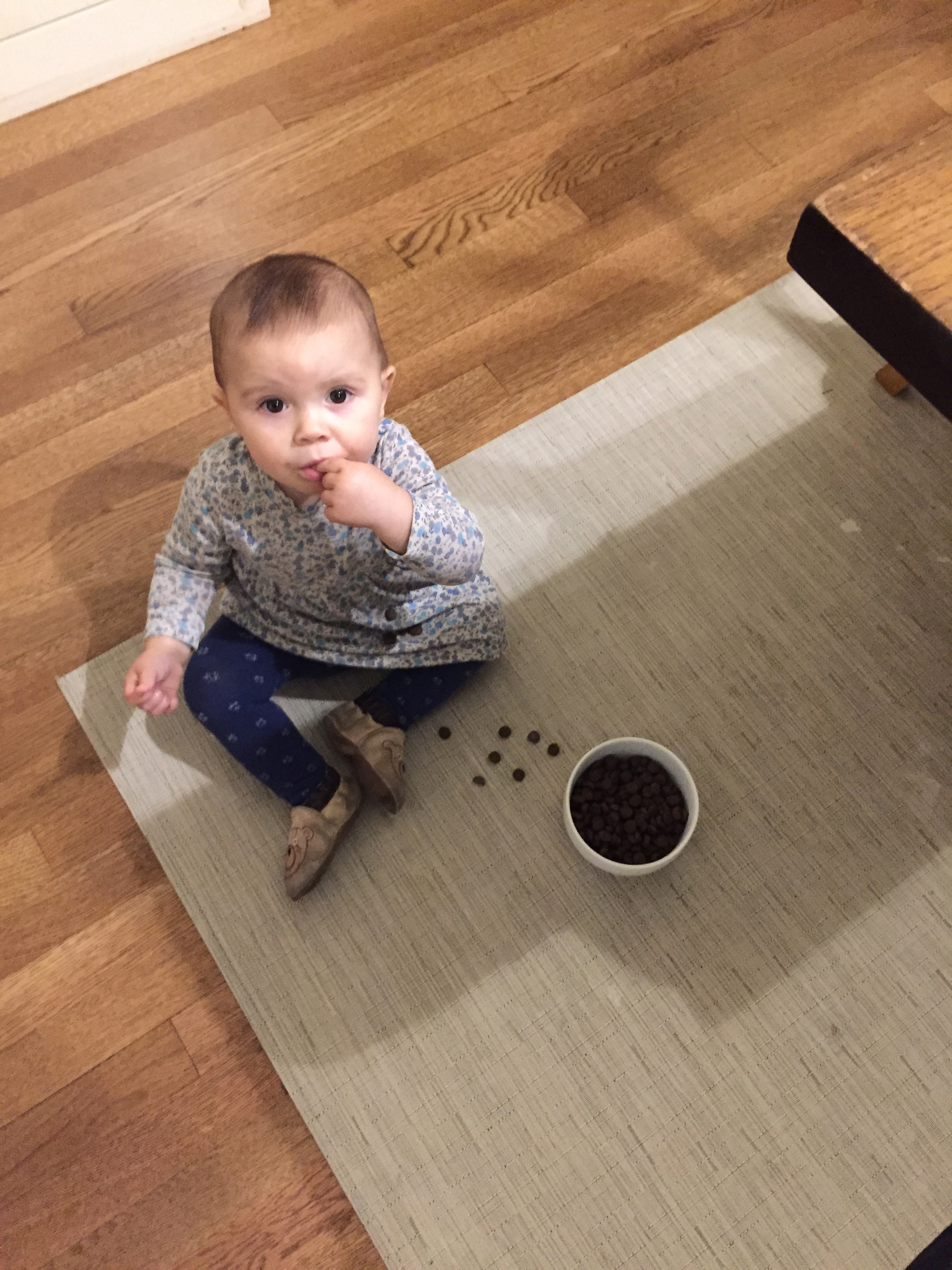She’s very vocal. Ba ba and da da da are among her favorites. She eats everything lentils, sausage, baguettes and fish (both the fresh and gold varietals).